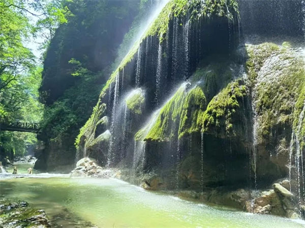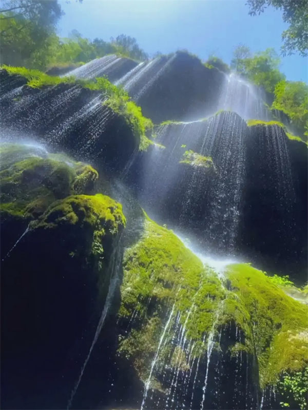 走南闯北,观景无数。见过许多绿,墨绿,深绿,浅绿,可从未看见岩石上覆着的一丛丛新绿,而且还有水珠溅落至上,绿如毯,一年四季如新,绿得苍翠,绿如新生,未染一粒尘。莫非隐匿在这深山峡谷中,与世隔绝,就要与众不同,留住人间过客,驻足欣赏她绝世风姿?