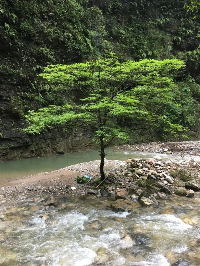 又一个春天来临,又一个夏天过去,秋去冬来。不知又过了几年。它孤傲地在峡谷中迎来一个又一个春夏秋冬。当年的岩石地,历经数年河水的冲刷,石块越积越多,砂石越积越厚,菖蒲蔓延一片,还有其他杂草丛生,已形成一小片绿洲。而它的主干,已有臂膀粗细了,枝丫纵横交错,树叶常年青绿,由于生长在河沟正中间,周边没有障碍物,它均衡地生长,树形虽不庞大,但树的轮廓已显优美丰姿。它已经开始引起过往游客的目光了。