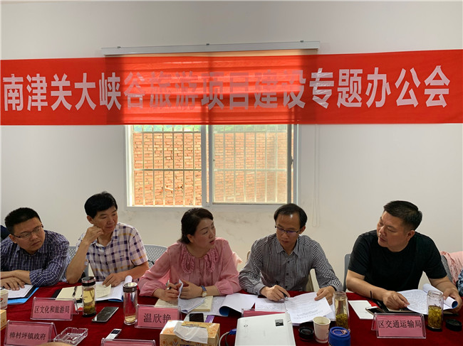 2019年5月30日,为加快南津关大峡谷项目建设,夷陵区副区长温欣艳,区政府办、区文化与旅游局、区发改局、区自然资源和规划局、区交通运输局、国网夷陵区供电公司、电信夷陵分公司、小溪塔街道、黄花镇、乐天溪镇和樟村坪镇等各级领导莅临南津关大峡谷项目施工现场调研项目建设情况,召开南津关大峡谷项目建设专题办公会。会议由区政府办副主任余从荣主持,股份公司董事长张朝文、总经理饶剑波及南津关公司董事长张朝武、总经理王伟等高层领导全程陪同并参会。