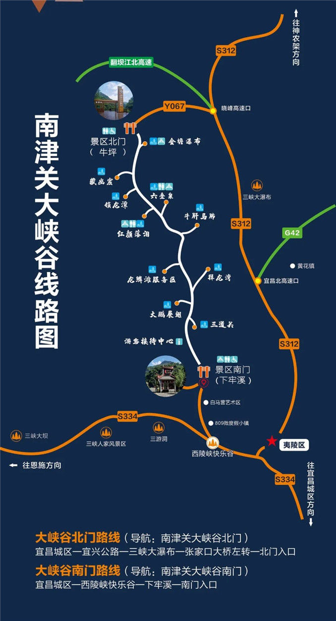 武荆高速或者宜黄高速—伍家岗收费站下—三峡大道—三峡高速出口—西陵峡峡口风景区—下牢溪—809微度假小镇—景区南门(姜家庙村)