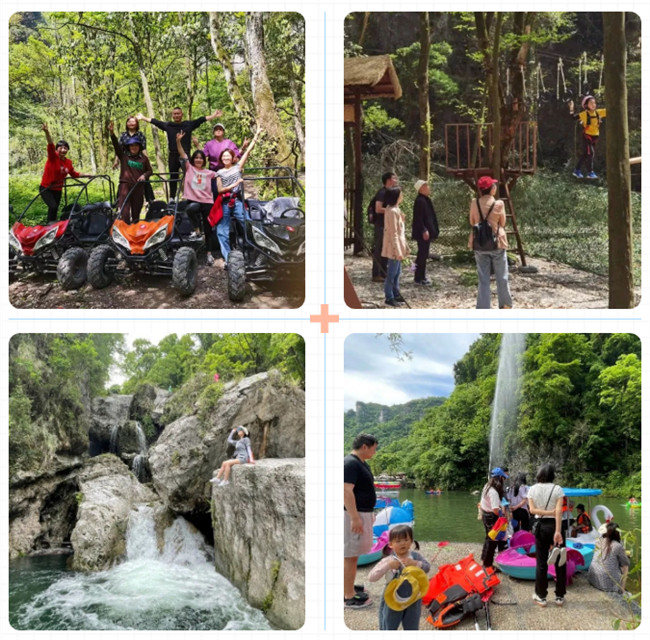 体验越野车风驰电掣的速度与激情、丛林穿越空中林木间重重关卡、溯溪挑战原始链条探险道的酷飒……还有水上世界的溪水畅游。