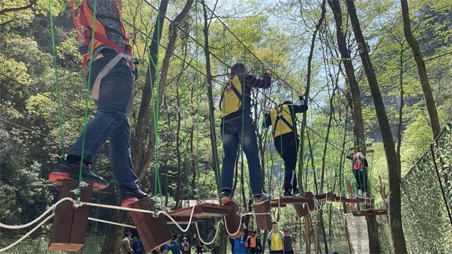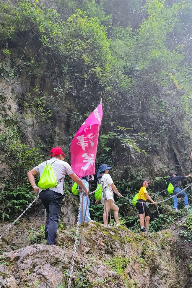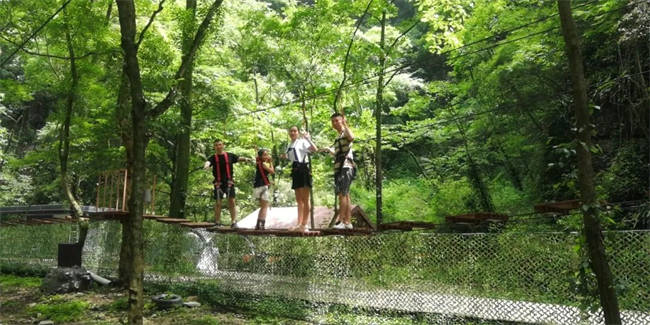 溯溪挑战由全长约250M的链条、索桥等构成,全程依靠脚踏铁蹬,手抓链条前进,徒手攀爬75度的坡面。
