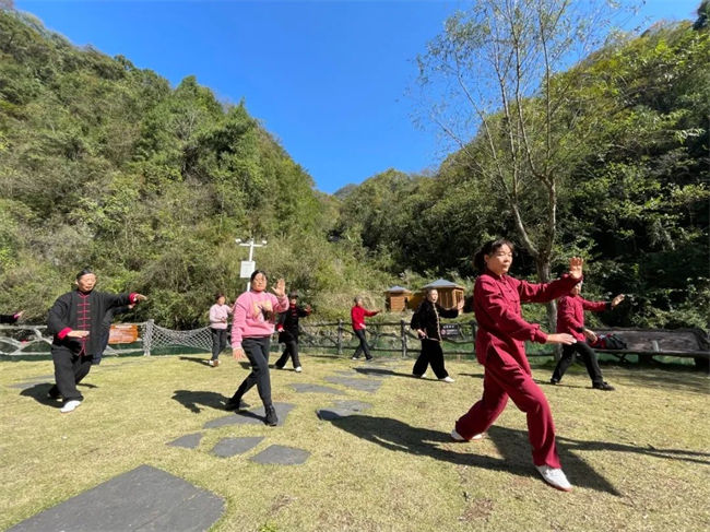 在秋日暖阳下,陪伴父母来徒步、练剑、打太极,在负氧离子密集的峡谷腹地尽情“森”呼吸。