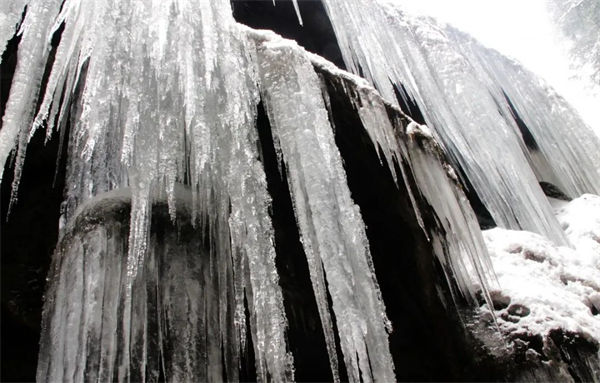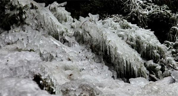 冰似晶帘山壁挂,瀑留永恒镁光圈。